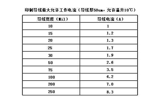 銅線的寬度應根據其能承載的電流進行設計。銅線的載流量取決于以下因素:線寬、導線厚度(銅鉑厚度)、允許溫升等。下表給出了銅線寬度、導線面積和導電電流(軍用標準)之間的關系。根據這一基本關系,可以適當考慮導線寬度。